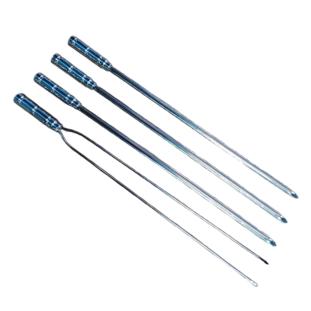 Conjunto 4 espetos para churrasco. Contém 3 und. de espetos simples aço inox 430 e 1 und. de espeto duplo aço cromado. Espetos com 70 cm de lâmina. Cabos lindos, revestidos em alumínio. Ideal para churrasco tradicional, costela em ripa, galeto, salchichão entre outros.