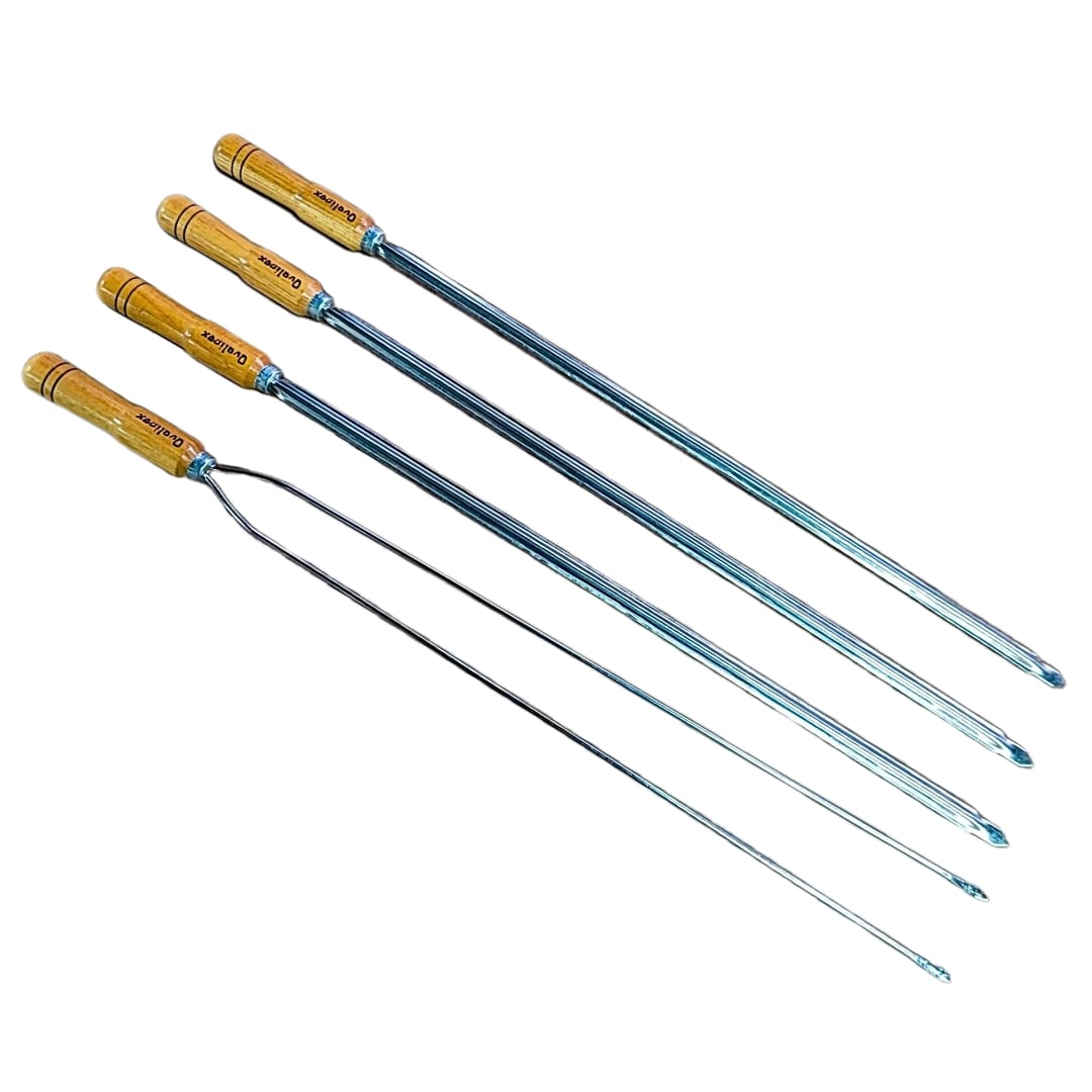 Conjunto 4 espetos para churrasco. Contém 3 und. de espetos simples aço inox 430 e 1 und. de espeto duplo aço cromado. Espetos com 70 cm de lâmina. Cabos em madeira de reflorestamento. Ideal para churrasco tradicional, costela em ripa, galeto, salchichão entre outros.