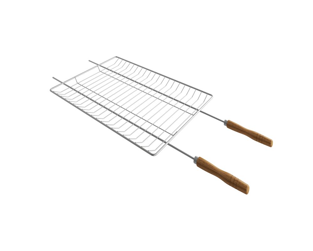 Grelha bandejão simples feita de arame de aço cromado com espessura de 1,5mm perfeita para assados em geral, com dois cabos de 16cm de madeira, possui duas pontas na extremidade permitindo usar a grelha em churrasqueiras, material de fácil limpeza.